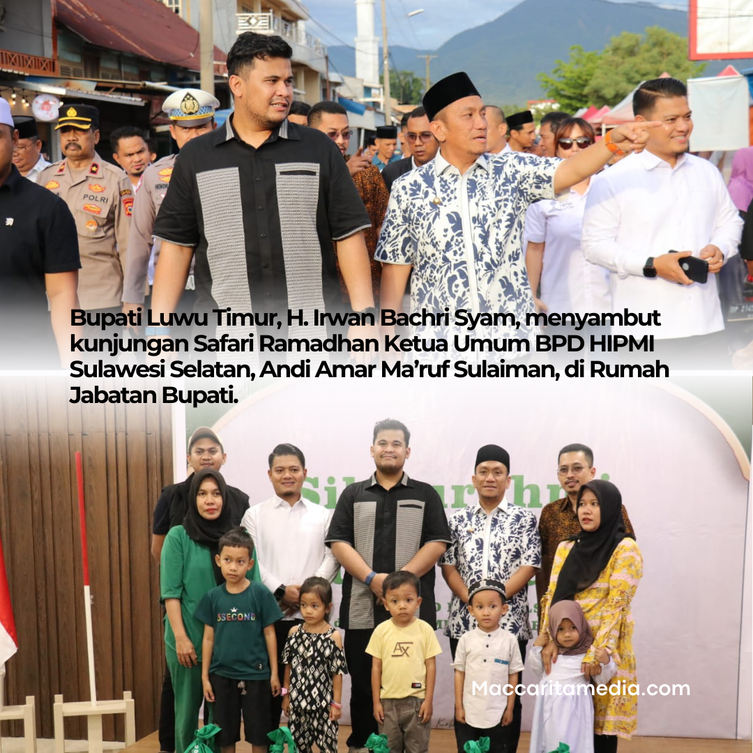 Luwu timur, Maccaritamedia.com 23 Maret 2025- Bupati Luwu Timur, H. Irwan Bachri Syam, menyambut kunjungan Safari Ramadhan Ketua Umum BPD HIPMI Sulawesi Selatan, Andi Amar Ma’ruf Sulaiman, di Rumah Jabatan Bupati. Dalam kunjungan ini, turut hadir Wakil Bupati Luwu, Dhevy Bijak, serta rombongan HIPMI.