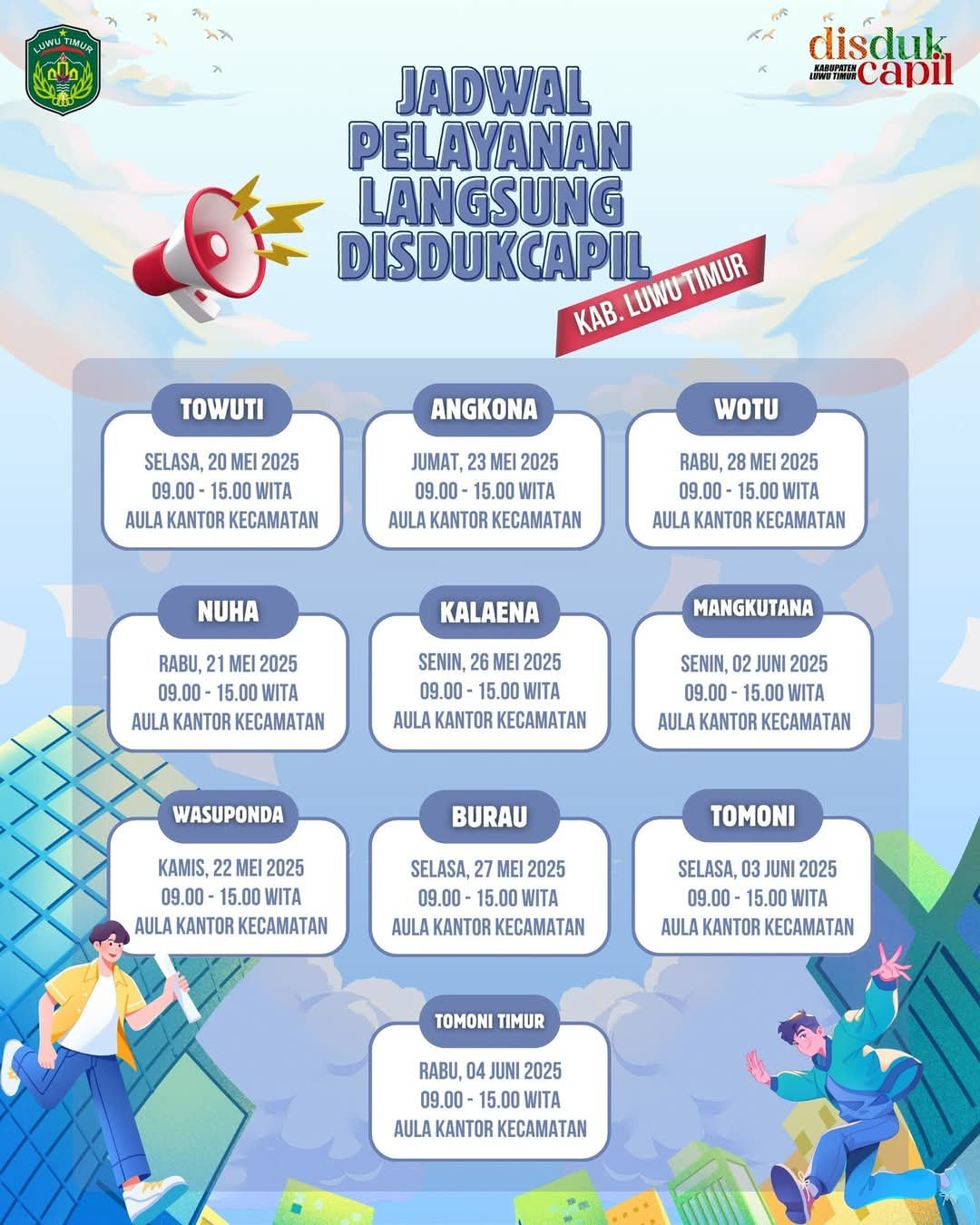 LUWU TIMUR – Dalam upaya meningkatkan akses dan kemudahan layanan administrasi kependudukan bagi masyarakat, Dinas Kependudukan dan Pencatatan Sipil (Dukcapil) Kabupaten Luwu Timur kembali menggelar Pelayanan Langsung di Kecamatan yang akan berlangsung mulai 20 Mei hingga 4 Juni 2025.