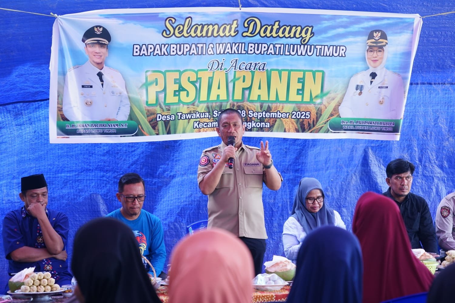 LUWU TIMUR – Bupati Luwu Timur, Irwan Bachri Syam menghadiri acara Pesta Panen di Desa Tawakua, Kecamatan Angkona, Sabtu (08/11/2025).