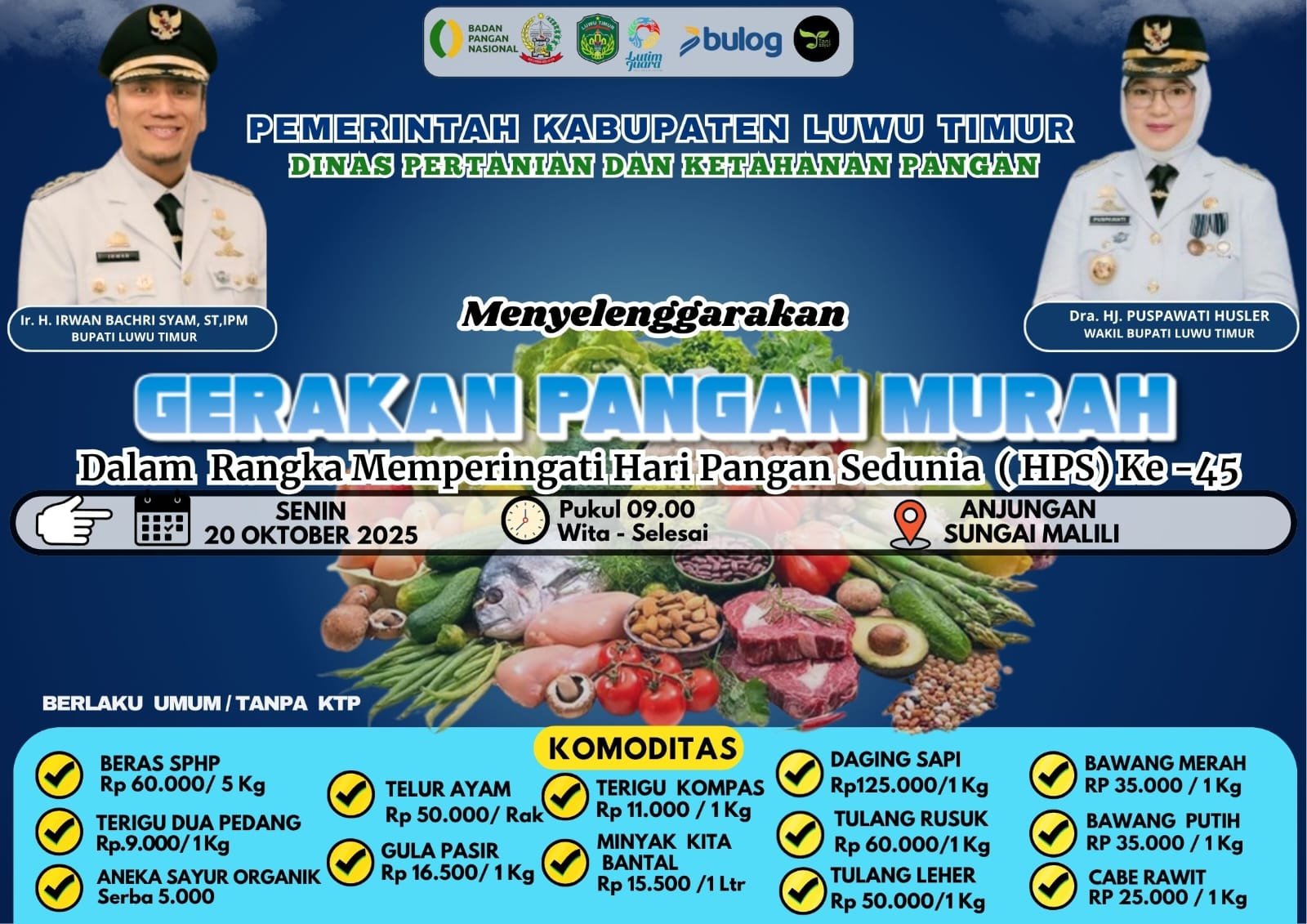 LUWU TIMUR – Dalam rangka memperingati Hari Pangan Sedunia (HPS) ke-45, Pemerintah Kabupaten Luwu Timur melalui Dinas Pertanian dan Ketahanan Pangan akan menggelar kegiatan Gerakan Pangan Murah yang dipusatkan di Anjungan Sungai Malili, Senin (20/10/2025).