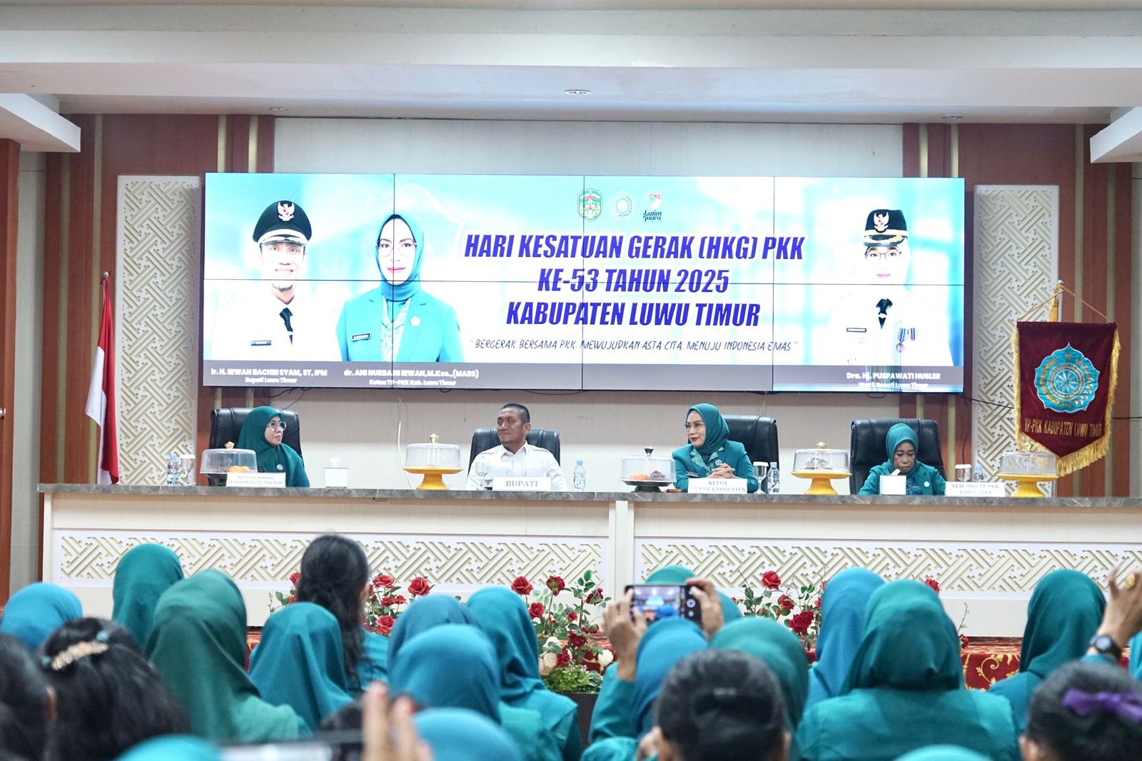 Peringatan HKG PKK dibuka oleh Bupati Luwu Timur, Irwan Bachri Syam, didampingi Ketua TP PKK Lutim, dr. Ani Nurbani Irwan. Turut Hadir, Staf Ahli PKK, Pengurus TP PKK tingkat kabupaten, kecamatan dan desa/kelurahan.